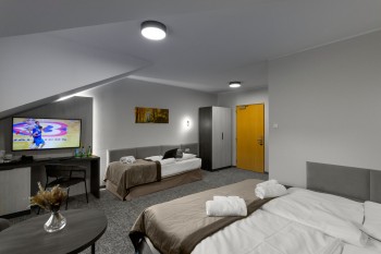 W pokoju znajdują się trzy osobne łóżka o wymiarach 90x200. Dwa łóżka standardowo są zsunięte tworząc duże łoże małżeńskie, jednak na życzenie Gości są rozdzielane.